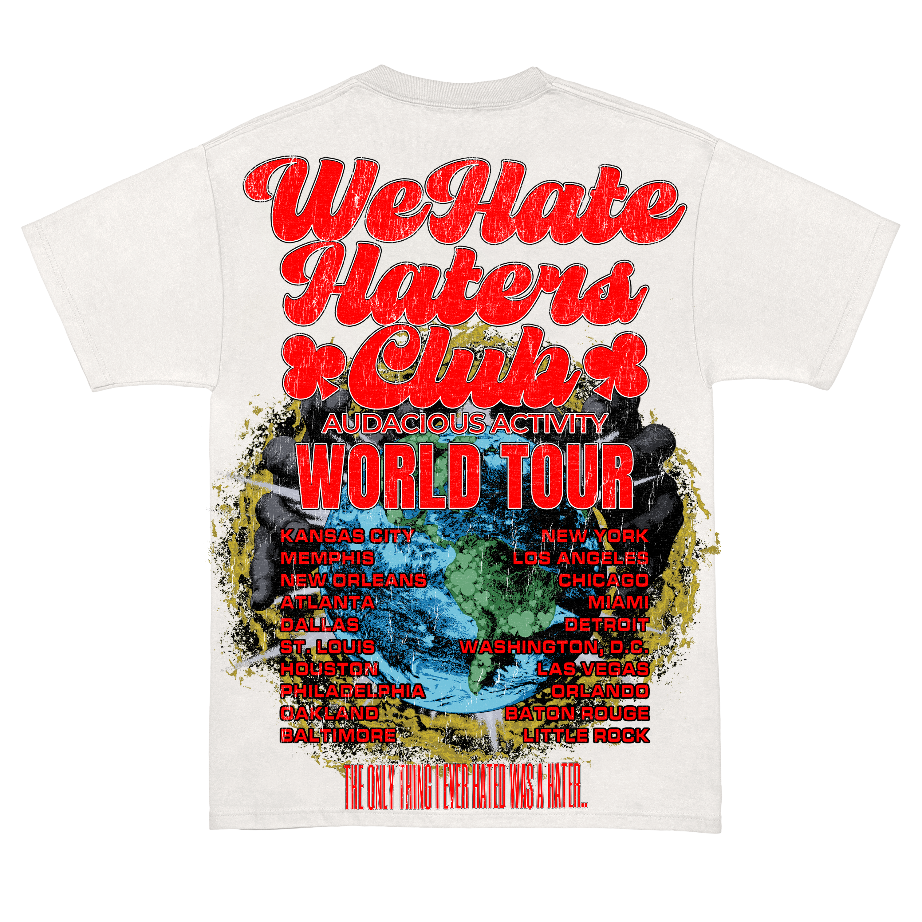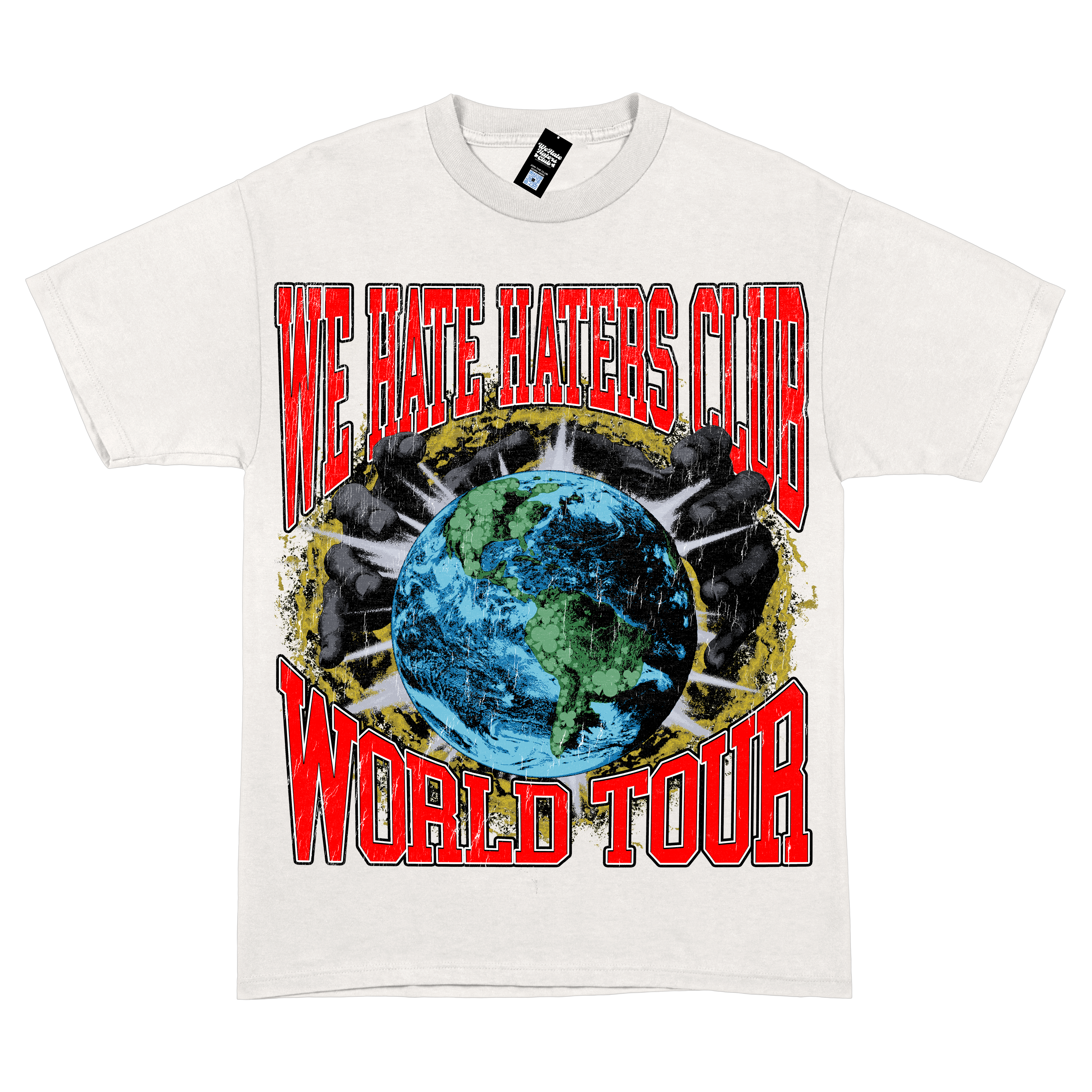 The ! World Tour WHHC Tee in white/red features an all-over direct-to-garment print showcasing a world tour theme that celebrates our most supportive cities. Designed with a relaxed drop shoulder fit, this graphic tee embodies the spirit of the We Hate Haters Club as it takes on the world. Perfect for those who value bold style and global unity.
