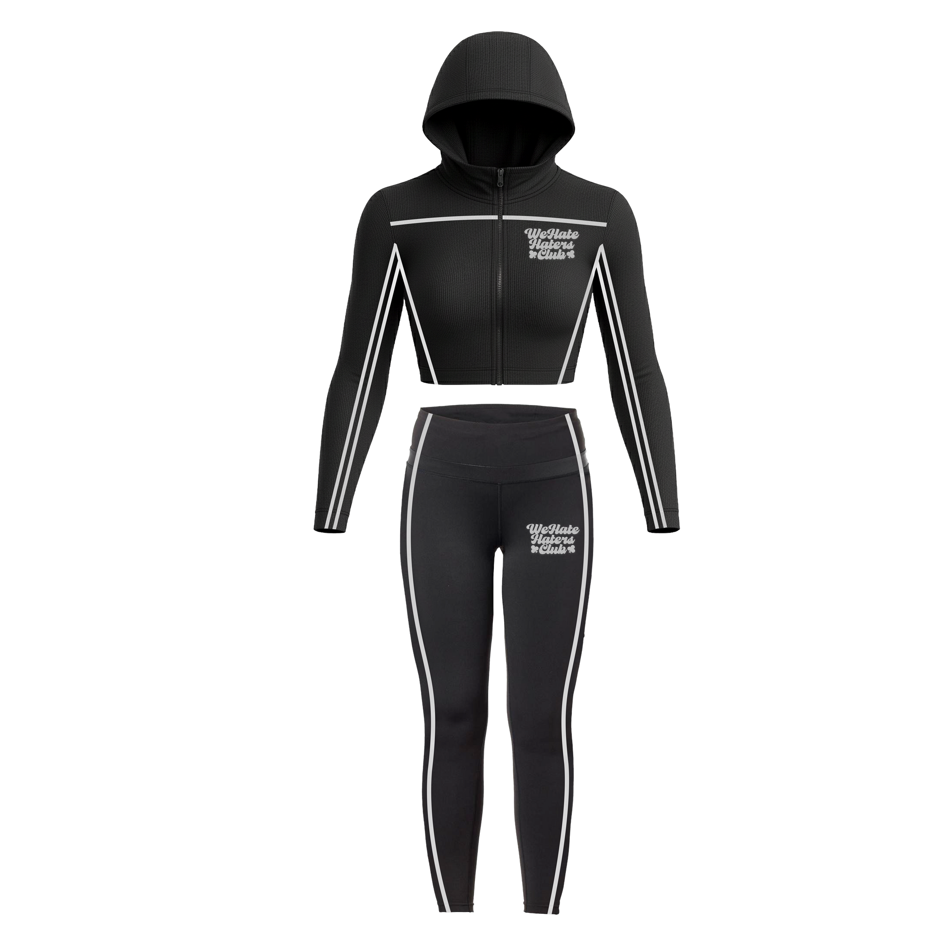 This #We Hate Haters Club Women's Compression 2 Piece Set combines a sleek black-and-white jacket and tights featuring piping details for a modern look. Crafted from stretchy, comfortable material, it offers compression support that enhances performance and recovery. Its versatile design makes it perfect for workouts, casual wear, or layering, providing both style and function in one all-purpose set.
