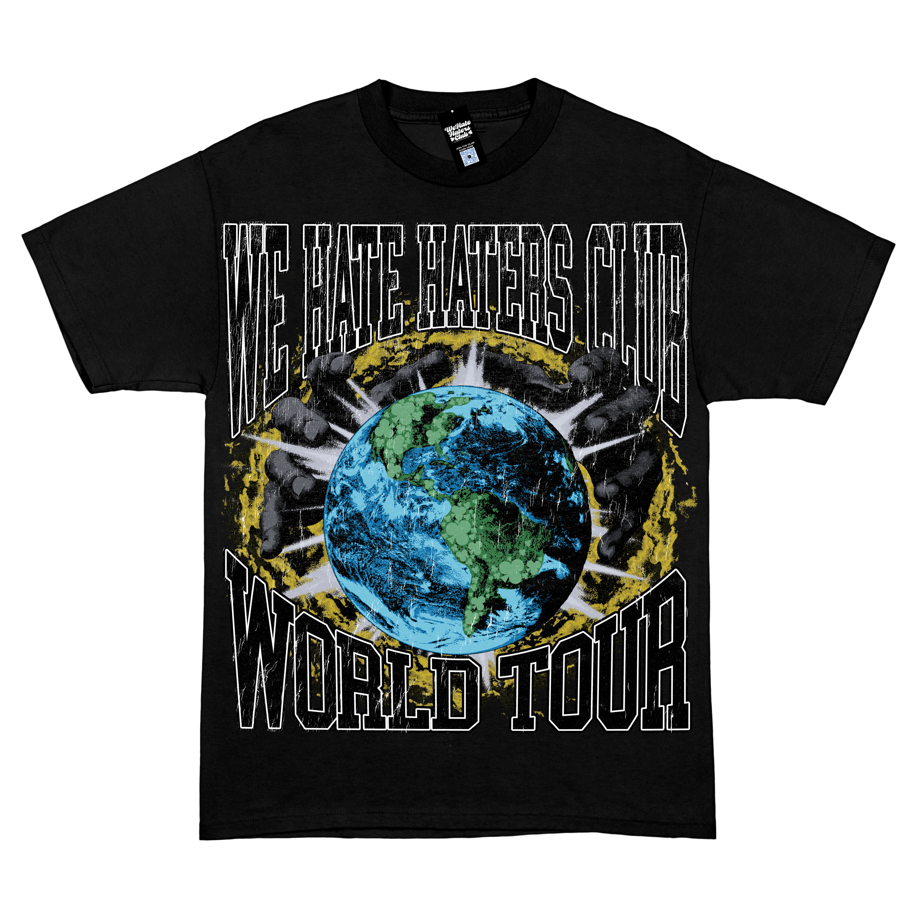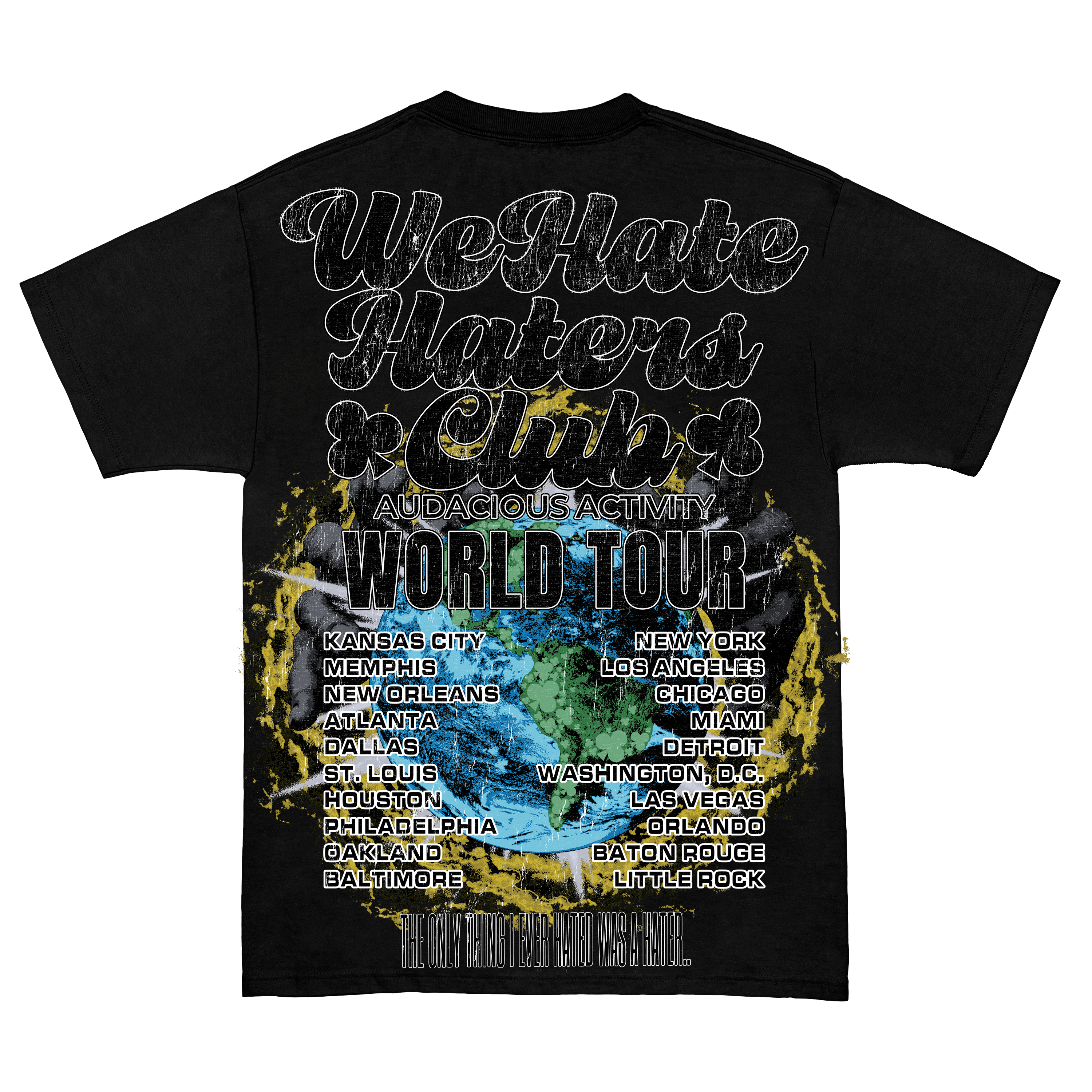 The ! World Tour WHHC Tee in black on Black features an all-over direct-to-garment print showcasing a world tour theme that celebrates our most supportive cities. Designed with a relaxed drop shoulder fit, this graphic tee embodies the spirit of the We Hate Haters Club as it takes on the world. Perfect for those who value bold style and global unity.