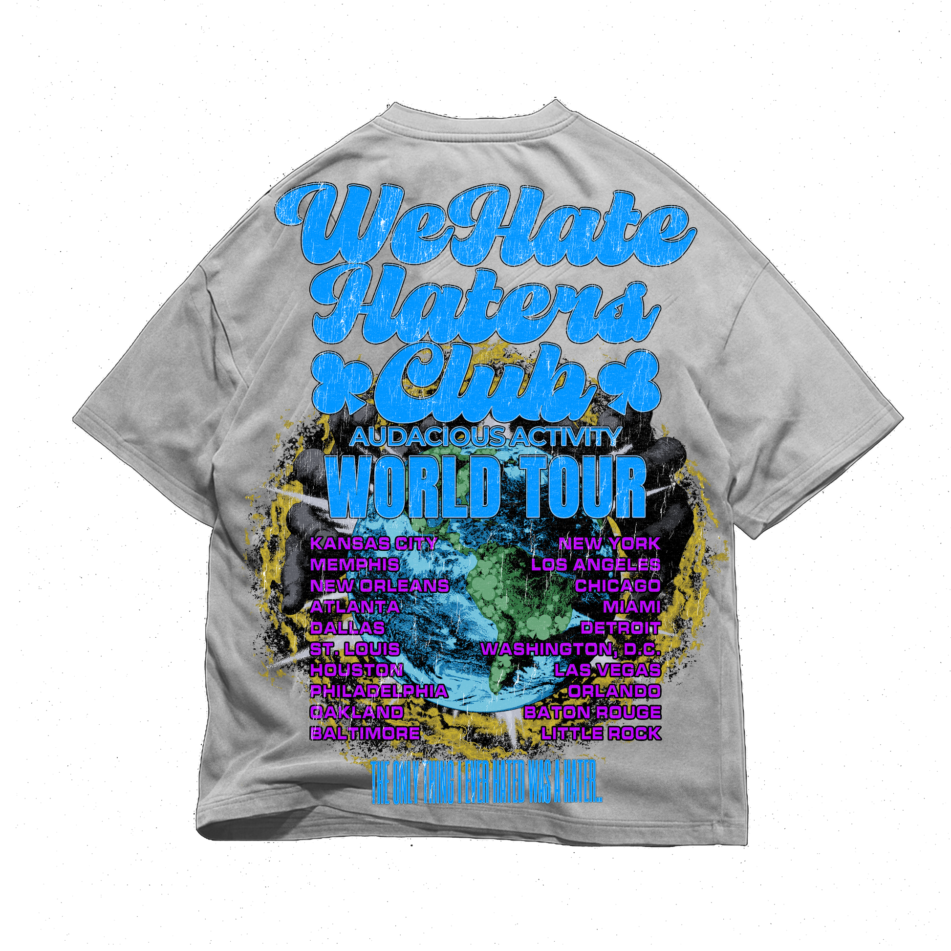 The ! World Tour WHHC Tee in Vintage Grey/Purple features an all-over direct-to-garment print showcasing a world tour theme that celebrates our most supportive cities. Designed with a relaxed drop shoulder fit, this graphic tee embodies the spirit of the We Hate Haters Club as it takes on the world. Perfect for those who value bold style and global unity.